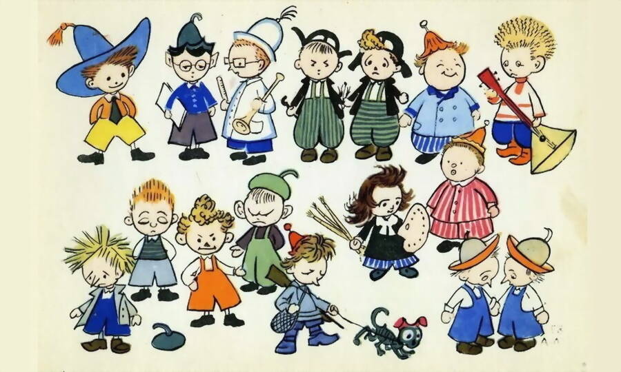 Такими были Незнайка и его друзья, нарисованными для первого издания 1954 года художником Лаптевым А.М.