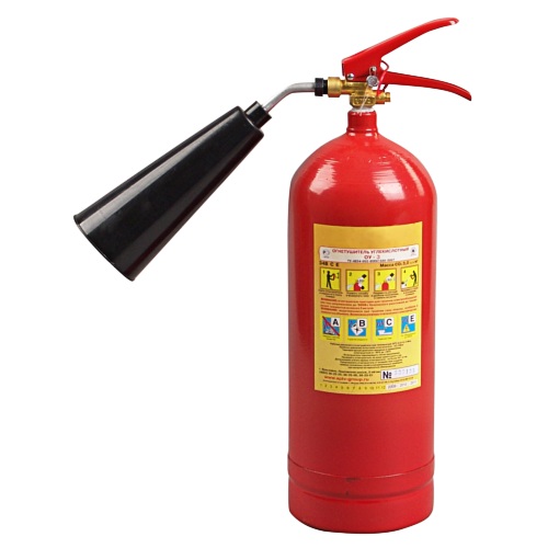 - установки с углекислотой. Принцип их работы состоит в том, что вокруг очага с открытым пламенем концентрируются хлопья, заменяющие кислород на углекислый газ. В результате такого действия в очаге значительно снижается температура. Такой огнетушитель просто незаменим для проведения тушения жидкостей из горючей категории (например, ДТ или бензин). Подходит он и для ликвидации огня на промышленных установках под напряжением, а также проводки и шлейфа;