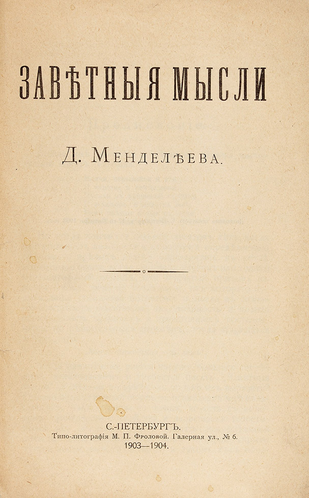 С начала 1900-х годов стали выходить «Заветные мысли» – историко-философский и социально-экономический трактат Менделеева, своего рода завещание потомкам, в котором содержатся итоги пережитого и передуманного по различным вопросам.